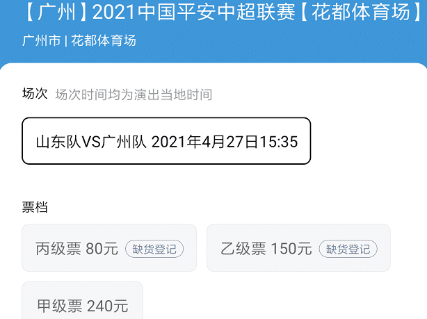 现在通过票务信息来看,这场山东泰山和广州队的比赛分为三个档次,80元、150元、240元,其中80元、150元这两个档次的球票已经是售罄的状态了,只剩下价格最贵的240元的球票了,不出意外的话,随着比赛的临近,相信最高价格的球票也会被球迷们抢完。
