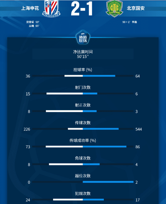这场比赛国安虽然掌握着64%的控球率,但是赢球的却是更加高效的上海申花,比赛结束之后,根据中超官方数据,这场比赛申花有多达六项数据碾压国安,其中包括(申花在前):