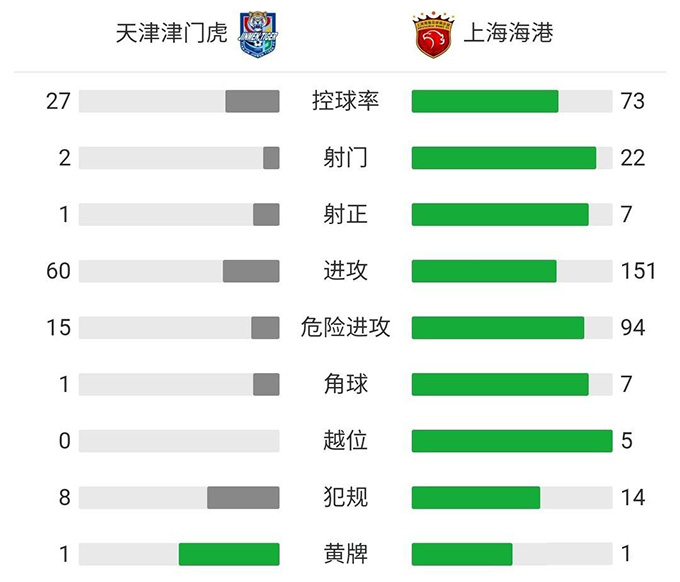 3分钟补时后全场比赛结束,最终上海海港6-1大胜天津津门虎。