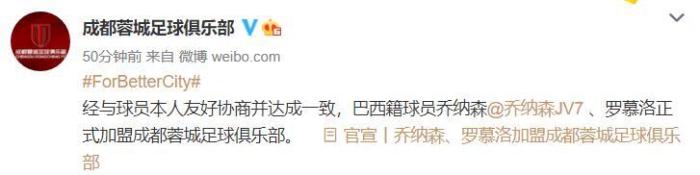 经与球员本人友好协商并达成一致,巴西籍球员乔纳森、罗慕洛正式加盟成都蓉城足球俱乐部。