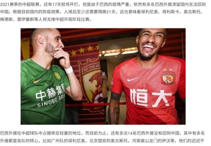 体坛: 中超14名巴西外援未回中国, 铁定缺席开局