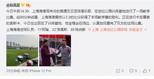 上海海港3-2击败南通支云!阿瑙和洛佩斯破门,奥斯卡术后观战