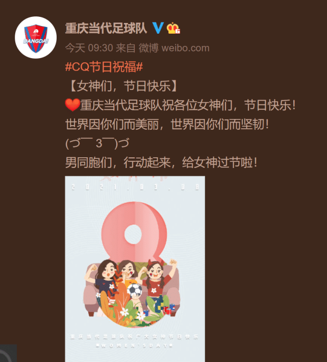 重庆当代足球队祝各位女神们,节日快乐!世界因你们而美丽,世界因你们而坚韧!男同胞们,行动起来,给女神过节啦!
