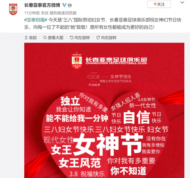 今天是“三八”国际劳动妇女节,长春亚泰足球俱乐部祝女神们节日快乐,向每一位了不起的“她”致敬!愿所有女性都能成为更好的自己!