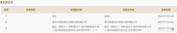 24直播网1月16日讯 据国家企业信用信息公示系统现实,青岛中创恒泰已正式改名为青岛青春岛足球俱乐部有限公司。