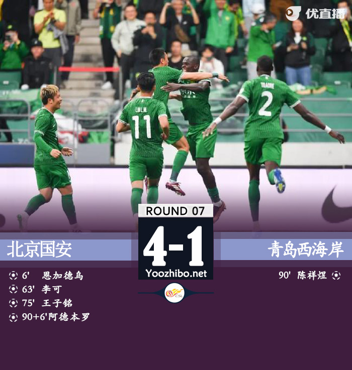 第96分钟,古加直传被叶尔杰提破坏,阿德本罗补射打空门建功,国安4-1西海岸。