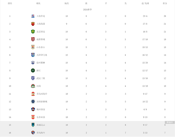 上海申花排名第一,他们本轮大胜实力不俗的浙江队之后,战绩来到8胜2平,依旧保持不败,以26分的优势排名第一。本赛季的上海申花不论是本土球员还是外援的发挥都很好,被认为很有可能夺得联赛冠军。