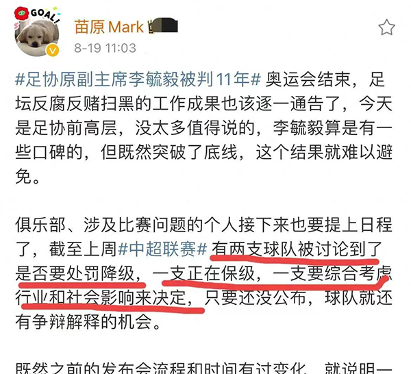 所幸的是近期名记苗原在社交媒体上曝光了中超罚单的最新情况,苗原表示俱乐部、涉及比赛问题的个人接下来也要提上一城,截止上周中超联赛有两支球队被讨论到了是否要触发降级,其中一支球队正在保级,一支要综合考虑行业和社会影响来决定,只要还没有公布,球队就还有争辩解释的机会。