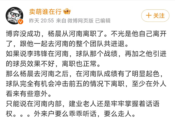 根据知名的足球记者“卖萌谁在行”爆料:“博弈没成功,杨晨从河南离职了,不光是他自己离开了,跟他一起去的整个团队共进退。”该媒体人强调:“如果说李玮锋在河南,球队那个战绩,再加之他引进的球员效果不好,离职是正常。杨晨去河南之后,在河南成绩有了明显起色,球队完全有机会冲击前五的情况下离职,至少在外人看来有些意外。”
