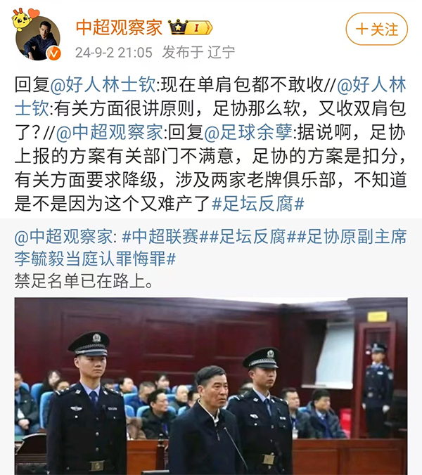 在时间过了8月31日,足协并没有公布处罚名单的时候,名记苗原也是很不满意的喊话足协,希望足协能够早一点公布相应的名单,让涉及的俱乐部早一点知道处罚结果,避免造成影响俱乐部赛季目标制定,造成中超整体受到影响。