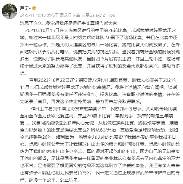 来源:24直播网09-12 12:0324直播网讯 北京时间9月11日晚,26岁的黑龙江冰城门将芦宁,写下长文对自己被足协禁赛5年的处罚进行回应。芦宁否认自己踢假球的同时,还直言会通过正规法律武器,来维护自己的尊严。