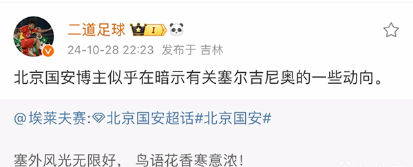 来源:24直播网10-30 15:5324直播网讯北京时间10月29日,国安资讯博主“埃莱夫赛”更新动态,若有所指写道:“塞外风光无限好,鸟语花香寒意浓!”随后,亚泰资讯博主“二道足球”转发了该动态并写道:“北京国安博主似乎在暗示有关塞尔吉尼奥的一些动向。”