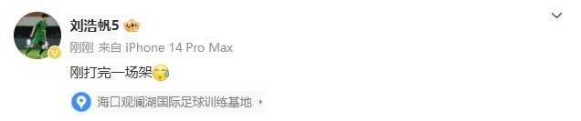 伊朗队不满进球有效险些想罢赛,尽管随后被劝回继续比赛,但此后,伊朗球员的拼抢动作越来越大。或许是对于此役对方过于“野蛮”的球风不满,U21国足队长刘浩帆赛后在社媒吐槽写道:“刚打完一场架。”不过随后刘浩帆就将该条社媒删除,显然刘浩帆并不希望将两队矛盾激化,毕竟这只是友谊赛。