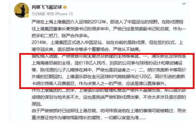 为什么呢?严俊是谁呢?简单的理一下,严俊是当年陈码头在上海海港的副手,在陈码头前往足协之后,严俊成为了上海海港的一把手。在陈码头和严俊的手中,他们经历了上海海港价值18亿人民币主场的打造,他们经历了上海海港120亿的投入,他们经历了上海海港在胡尔克、奥斯卡等等外援上面的巨额投资。严俊还经历了上海海港这边迟迟未缴的引援调节费以及海港的各种福利,虽然从职务上来说,严俊并没有直接插手上海海港足球俱乐部,但是从如今有的千丝万缕来看,他和陈码头是摆脱不了关系的。