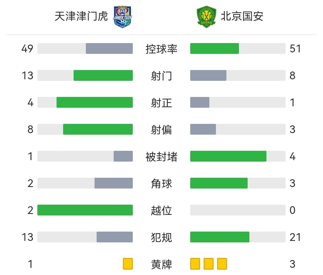 第11分钟,津门虎右路定位球机会梅里达主罚打在横梁上弹出,国安逃过一劫。