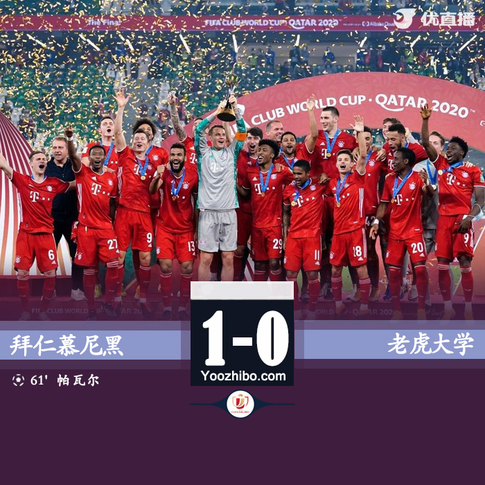 24直播网2月12日讯 北京时间2月12日凌晨2点,世俱杯决赛,拜仁慕尼黑对阵老虎大学队。上半时双方互交白卷,基米希世界波破门被吹无效,萨内中门框。下半时帕尔瓦攻入制胜一球,托利索远射被扑击中门柱,科斯塔错失机会。最终,拜仁慕尼黑1-0战胜老虎大学,拜仁获得世俱杯冠军,成功加冕六冠王。