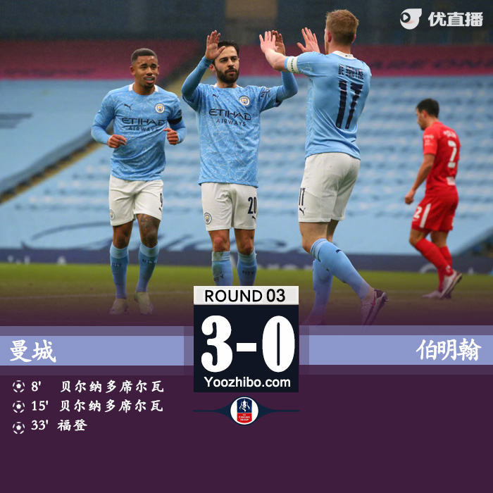来源:24直播网01-11 00:58 24直播网讯:北京时间1月10日21:30,足总杯第三轮比赛,曼城对阵伯明翰。上半场,B席开场不久就凌空抽射破门,随后接德布劳内助攻再下一城,热苏斯造险,福登贴地斩建功;下半场,热苏斯禁区内倒地但裁判没有表示,马赫雷斯破门但越位无效,曼城3-0伯明翰晋级足总杯第四轮。